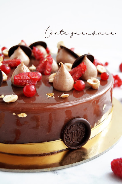 Una volta eseguite tutte le componenti del dolce assemblarlo in questo modo: prendere l'anello (vi consiglio di porre l'anello per una mezz'ora in frigorifero prima di usarlo, in modo che sia ben freddo) e foderarlo con la pellicola trasparente in modo da sigillarne la base che andrete a poggiare su una teglia. Foderarne poi i bordi con dell'acetato. Colare per poco più di 2/3 la mousse al cioccolato, estrarre l'inserto e porlo all'interno dell'anello. Spingerlo leggermente con la mano in modo da assestarlo bene. Finire di riempire con la mousse avanzata e poggiare il secondo disco di biscuit che andrà a comporre la base del dolce. Livellare bene e congelare. Scaldare la glassa a microonde e portarla a 33°C. Estrarre la torta congelata dall'anello e glassarla. Finire di decorare con cremoso alla nocciola, dischi di cioccolato fondente, lamponi freschi, foglioline d'oro e ribes.