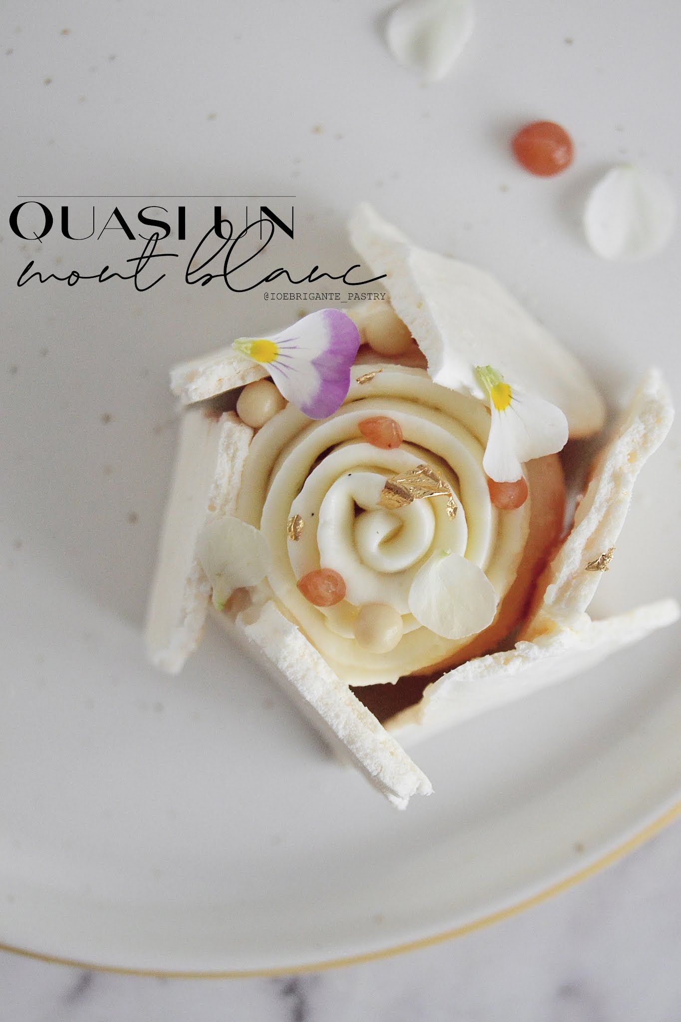 Finire di decorare a piacere con crema pura di marroni, foglie d'oro alimentari, perle di cioccolato croccanti e fiori eduli.